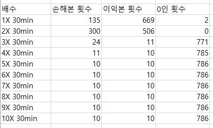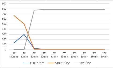 먼저 위 스크린샷에서 볼 수 있는 것처럼 일단 손해본 횟수와 이익본 횟수, 그리고 0이라고 거래가 전혀 나오지 않은 횟수를 비교해서 한꺼번에 보고자 합니다.