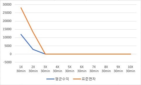 여기서도 표준편차를 3배수 넘어가는 시점에서 그렇게 좋지 않은 상황이 나온다는 생각이 듭니다. 아무튼 2배수가 되면서 손해본 횟수가 늘어나는 감이 있지만, 그걸 감안해도, 일단 여기서는 2~3배수 사이를 더 자세히 봐야 겠다는 생각이 듭니다.