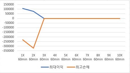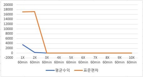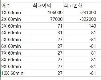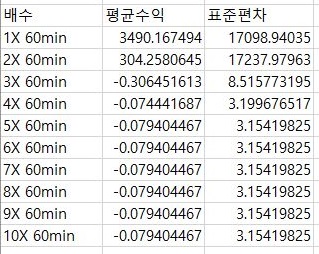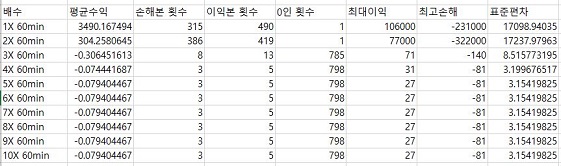60분봉에서도 변함없이 일단 2~3배 사이에 무언가가 있다면 있다고 할 수 있고, 그 이후로는 그렇게 의미가 있어 보이지 않는 결과가 나왔습니다.