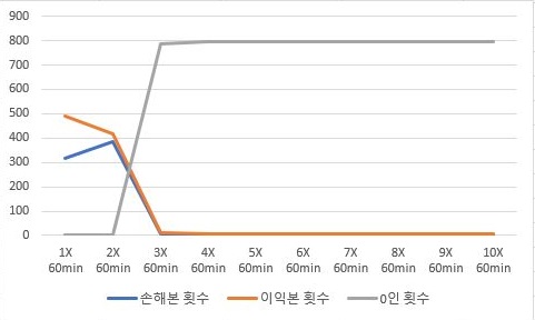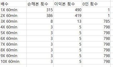 여기서 특이한 것을 하나 알았는데, 일단 같이 3배수 이상부터는 그렇게 의미없는 거래량이 없는 것이 이어지지만, 문제는 손해량에 비해서 이익량이 엄청나게 적다는 것 입니다.