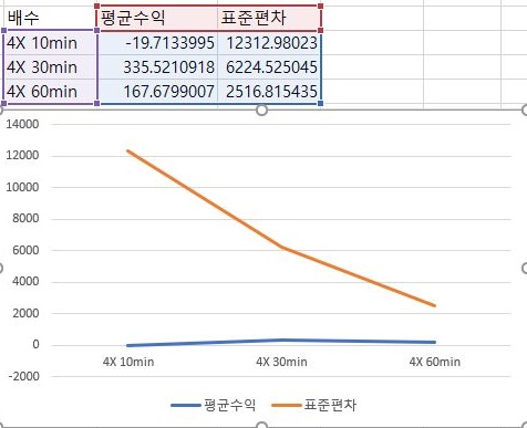 이러한 경향은 2배수를 했는 표준편차에서도 마찬가지로 나왔습니다. 일단 이렇게 해서 나온 결과를 살펴 보자면, 분봉의 간격이 커지면 커질수록 손해는 더 커지고, 이익은 적어집니다.