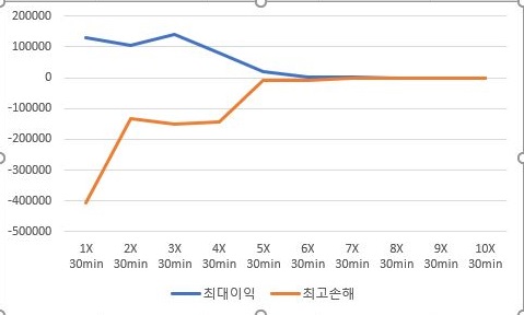 그리고 나서 최대한으로 본 이익과 최고로 많이 본 손해의 크기를 비교하는데, 일단 2배수에서 이익을 올리면서 손해는 크게 줄여서 2배수가 좋을 듯 하지만.........