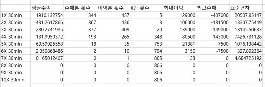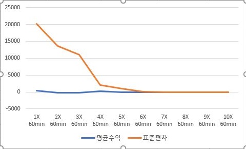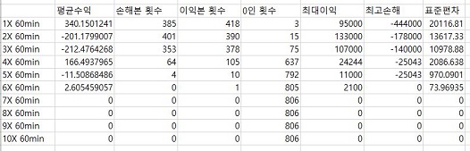 문제는 위 스크린샷을 보시면, 사실상 1배수 외에는 선택사항이 없다시피 합니다. 아니 1배수 조차도 선택사항이 되지 않는 이유가 너무 평균적으로 나오는 수익이 낮아서, 도저히 써먹을 수 없는 상황에 처해져 있습니다. 결국 60분봉에서는 사실상 사용할 가치가 없다는 결론이 나왔습니다.