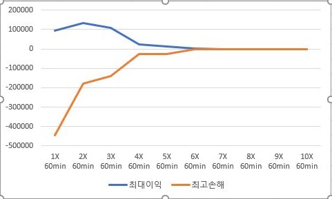 그리고 나서 최대한으로 본 이익과 최고로 많이 본 손해의 크기를 비교하는데, 일단 2배수에서 이익을 올리면서 손해는 크게 줄여서 2배수가 좋을 듯 하지만.........