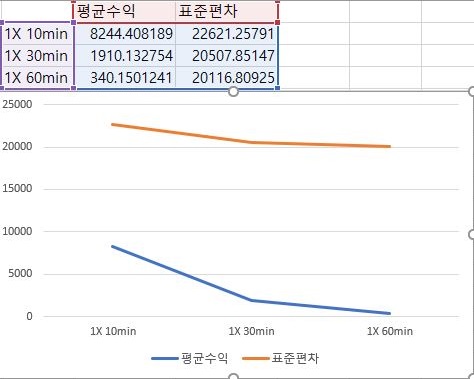 2배수 표준편차에서는 아예 위 스크린샷과 같이 마지막 60분봉을 기준으로 해서 결론을 내릴 경우에는 아예 이익과 손해의 갯수가 역전이 되는 것을 볼 수 있습니다.