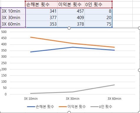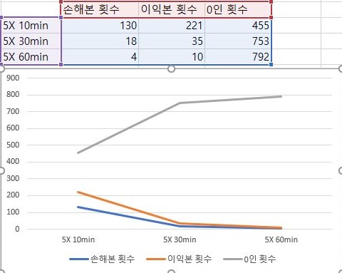 이제 손해를 본 종목의 갯수와 이익을 본 종목의 갯수를 한번 확인해 볼 시간인데, 일단 분봉의 간격이 넓어지면 넓어질 수록, 상황이 더 좋지 않아 진다는 것을 확인할 수 있습니다.