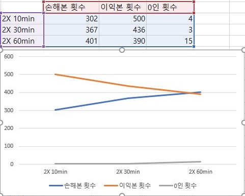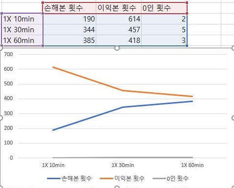 이제 손해를 본 종목의 갯수와 이익을 본 종목의 갯수를 한번 확인해 볼 시간인데, 일단 분봉의 간격이 넓어지면 넓어질 수록, 상황이 더 좋지 않아 진다는 것을 확인할 수 있습니다.