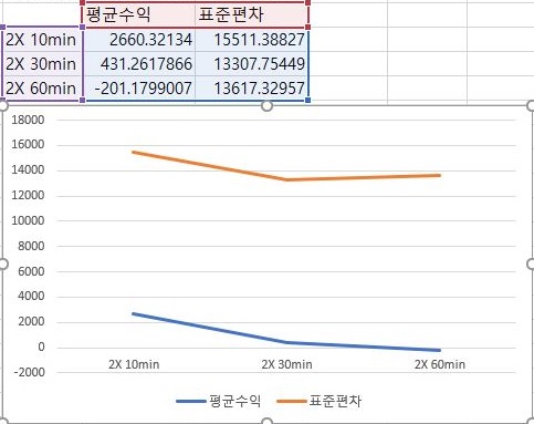 2배수 표준편차에서는 아예 위 스크린샷과 같이 마지막 60분봉을 기준으로 해서 결론을 내릴 경우에는 아예 이익과 손해의 갯수가 역전이 되는 것을 볼 수 있습니다.