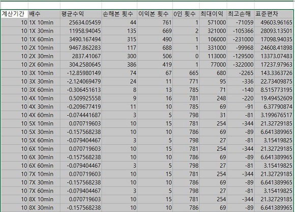 그리고 나서 여기서도 역시나 1배수때와 마찬가지로 계산에 동원된 분봉의 갯수가 많아지면 많아질 수록 이익은 적게 보고, 손해는 많이 본다는 현상이 지속되고 있습니다.
