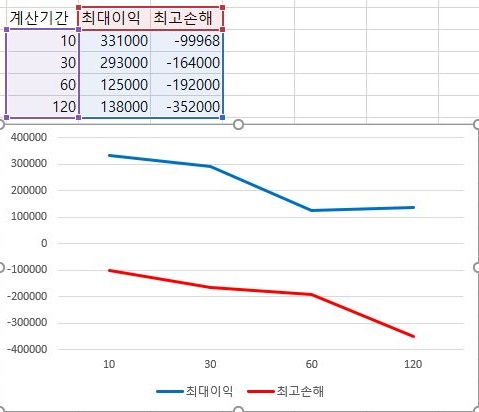 그리고 나서 그래프를 그려보니까 더 놀라운 결과가 나오는 것을 확인할 수 있었습니다. 어떻게 된 것이 더 많은 분봉을 동원하면 할 수록 이익의 최대치는 줄어들고, 손해의 최대치는 증가하는 악순환을 관측할 수 있었습니다.