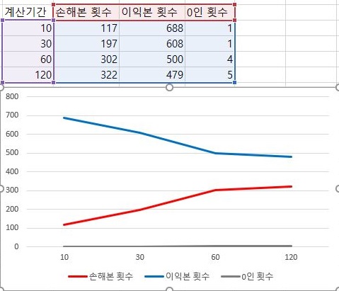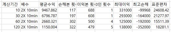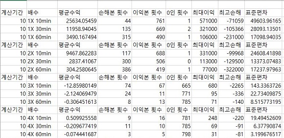 그리고 나서 여기서도 역시나 1배수때와 마찬가지로 계산에 동원된 분봉의 갯수가 많아지면 많아질 수록 이익은 적게 보고, 손해는 많이 본다는 현상이 지속되고 있습니다.