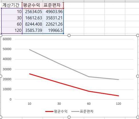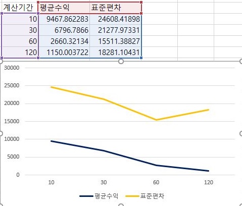 그리고 나서 다음으로 평균과 표준편차를 한번 비교해 보았습니다. 일단 여기서도 평균수익이 어째서 인지 계산에 동원된 분봉의 갯수가 증가하면 증가할 수록 오히려 감소하는 것을 볼 수 있었습니다.
