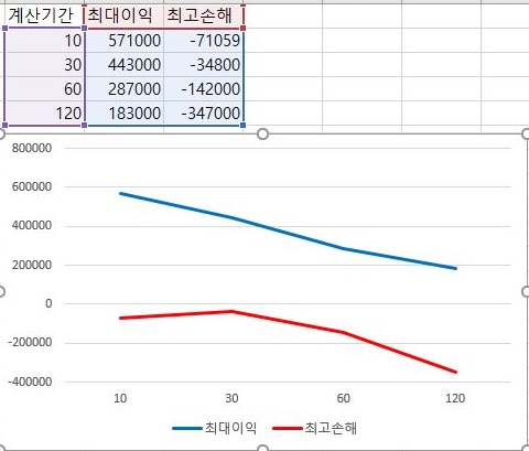 마지막으로 손해의 최대량과 이익의 최대량을 서로 비교해 보았는데, 여기서 알 수 있는 것은 계산에 동원된 분봉의 갯수가 커지면 커질수록, 오히려 제 기대와는 다르게 손해는 더 커지고 이익은 더 줄어드는 것을 확인할 수 있었습니다. 아무래도 이제까지 동원한 룰이 120분봉이었던 것을 감안하면, 이 가장 좋지 않은 룰로 하루에 이익을 내고, 장기적으로 손해는 본 상황에서 하루에 이익을 본게 더 기적이었던 것 같습니다.