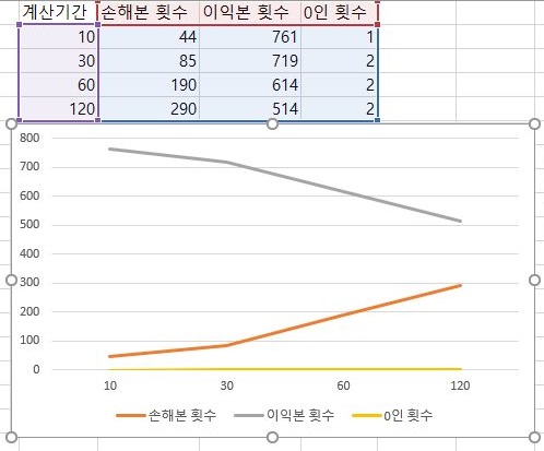 그리고 전혀 거래가 없었는 종목의 갯수에는 큰 변화가 없지만, 점점 평균과 표준편차를 구하는데 들어간 분봉의 갯수가 증가하면 증가할 수록 이익을 보는 경우는 줄어들고, 손해는 본 경우는 더 커진다는 것을 볼 수 있었습니다.
