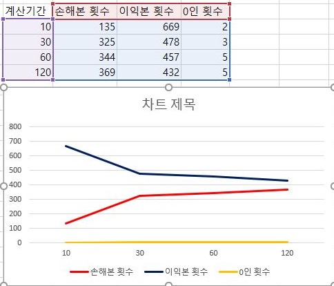 그리고 나서 다음으로 이익의 최대치와 손해의 최대치를 한번 비교해 보았습니다. 역시나 계산에 동원된 분봉의 갯수가 많으면 많을 수록, 표준편차에 1배수를 해준 경우에는 이익은 줄어들고, 손해는 커지는 것을 확인할 수 있었습니다.