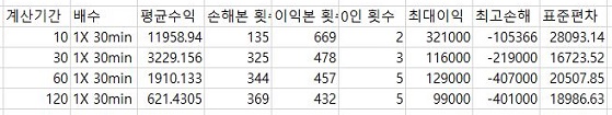 일단 위 스크린샷에서 볼 수 있는 것처럼 우선 30분봉 캔들 챠트를 이용해서 나온 결과만을 모아서 비교하도록 도표로 만들어 보았습니다.
