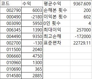 먼저 데이터 베이스 파일에 있는 이익과 손해를 모두 모아서, 엑셀의 파일에 하나하나 옮기도록 해 보도록 합니다. 이렇게 해서 옮겨지면, 여기서 평균수익과 이런저런 지표를 계산합니다.