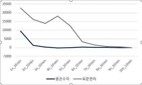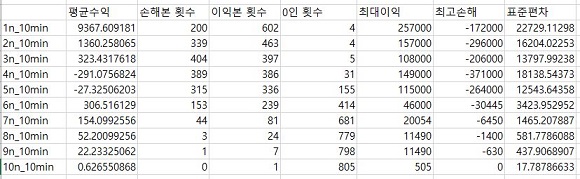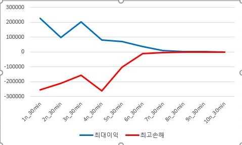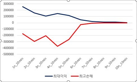1번조건에서 2번 조건으로 갈수록 엄청나게 평균수익이 감소했고, 3번 조건부터는 아예 수익이라는 것이 없는 상태로 떨어지는 것을 보아서, 그 이상은 고려할 가치도 없어 보입니다.