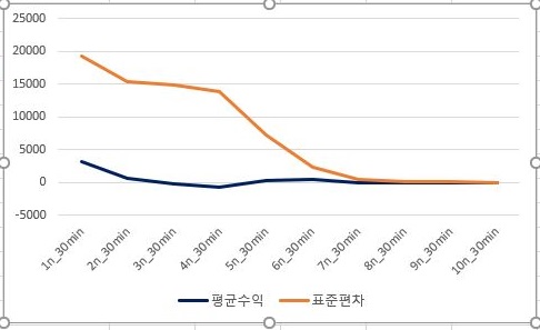 그리고 나서 평균수익과 표준편차를 한번 비교해 보았습니다. 일단 여기서는 2번째 조건이후로는 거의 수익이 나지 않는다는 것을 확인할 수 있었습니다.