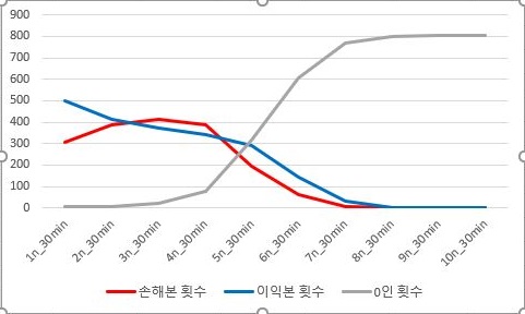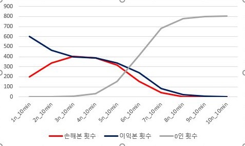 그리고 나서 손해를 본 종목의 갯수과 이익을 본 종목의 갯수도 한번 비교해 보았는데, 문제는 2번 경우부터는 어째서 손해를 이익보다 더 많이 보고 있었고, 그나마 역전이 되는 5번째 종목부터는 아예 거래가 없는 경우의 수가 많이 나오고 있는 것 입니다.