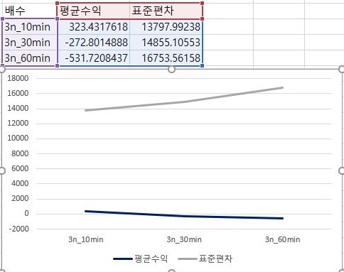 그리고 더 빡빡한 조건인 3번이라고 RSI지수가 60% 이상이면 매도, 40% 이하면 매수를 하라는 조건을 걸었을 경우에는 더 수익이 바닥을 기는 것을 확인할 수 있었습니다. 그나마 계산에 사용된 분봉이 10분봉일 경우에는 작지만 수익이 나오긴 했습니다.