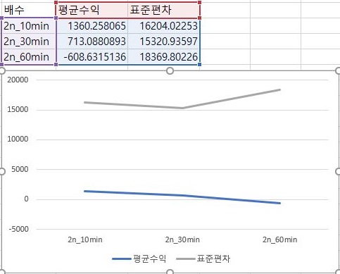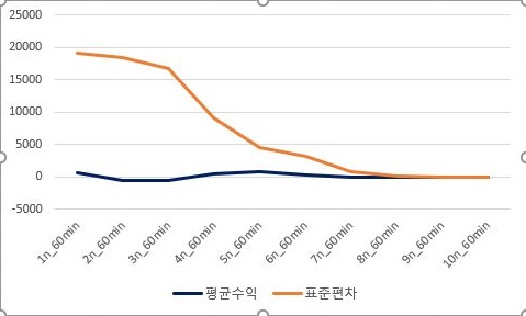 먼저 평균수익와 표준편차를 한번 비교해 보았습니다. 일단 1번 조건에서 그나마 수익이 있다고 할 수 있는데, 문제는 거의.............가치가 없어 보이는 상황입니다.