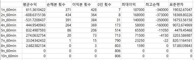 먼저 평균수익와 표준편차를 한번 비교해 보았습니다. 일단 1번 조건에서 그나마 수익이 있다고 할 수 있는데, 문제는 거의.............가치가 없어 보이는 상황입니다.