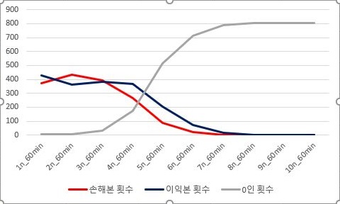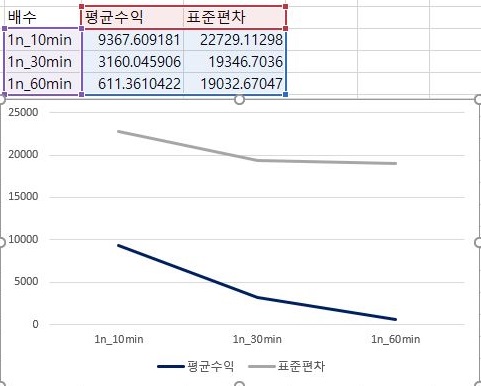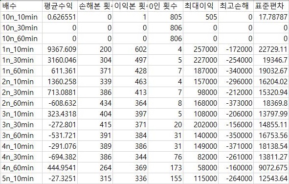 그리고 더 빡빡한 조건인 3번이라고 RSI지수가 60% 이상이면 매도, 40% 이하면 매수를 하라는 조건을 걸었을 경우에는 더 수익이 바닥을 기는 것을 확인할 수 있었습니다. 그나마 계산에 사용된 분봉이 10분봉일 경우에는 작지만 수익이 나오긴 했습니다.