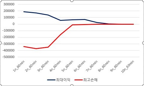 그리고 나서 이익의 최대치를 보면, 조건의 숫자가 늘어날 수록 - 좀더 매도/매수에 빡빡한 기준을 제시할 수록 최대로 본 이익은 줄어드는 경향이 있습니다. 결국 60분봉을 사용해서 구하는 이 RSI지수는 거의 쓸 수 없다는 결론이 나왔습니다.