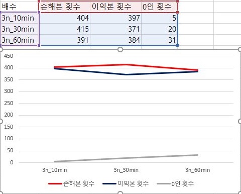 그리고 3번 조건에서는 거의 손해를 항상 보고 있다고 해야 할 정도로 상황이 좋지 않은 것을 볼 수 있었습니다. 아무튼 이에 대해서는........... 일단 거래가 전혀 없는 경우는 상대적으로 적다고 할 수 있겠습니다.