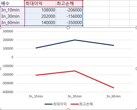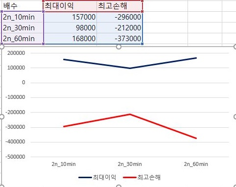 아무튼 이후에는 평균수익을 보면 거의 바닥이라서, 일단 최대로 본 이익의 크기와 손해의 크기를 서로 비교해 보았습니다. 1번 조건에서는 이익은 그렇게 크게 줄어들지 않지만, 손해의 크기가 급격하게 늘어나서, 계산에 사용한 분봉 차트의 간격을 늘리는 것이 좋지 않아 보입니다.
