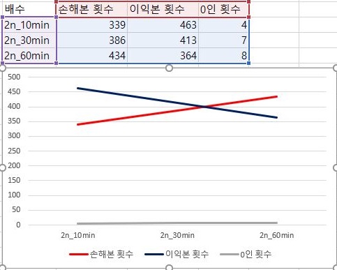 그리고 3번 조건에서는 거의 손해를 항상 보고 있다고 해야 할 정도로 상황이 좋지 않은 것을 볼 수 있었습니다. 아무튼 이에 대해서는........... 일단 거래가 전혀 없는 경우는 상대적으로 적다고 할 수 있겠습니다.