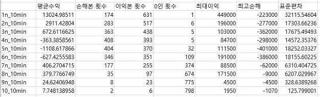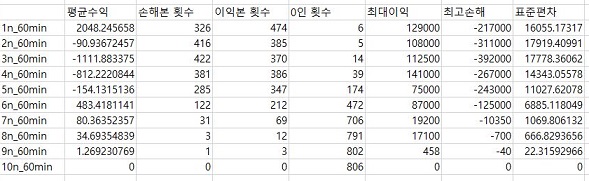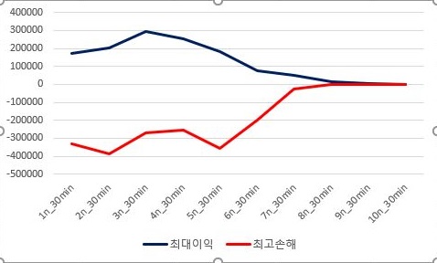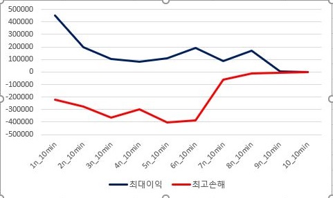 그리고 나서 최대로 본 이익과 제일 크게 본 손해를 비교해 보았습니다. 일단 여기서 어느 조건이 좋은지 정리를 바로 할 수는 없지만, 사실상 평균수익을 볼 때 1번 조건 말고는 크게 쓸모가 없다는 것을 알 수 있었습니다.