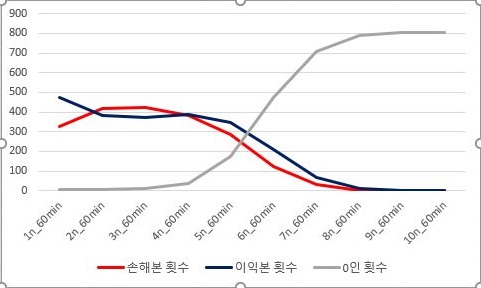 그리고 이익과 손해의 최대치에 대해서 한번 비교를 해 보자면, 그렇게 딱 부러지는 결론을 내리기는 힘듭니다. 그렇지만, 평균수익부터 살펴보면, 거의 1번 조건에서 손해량이 큰 것을 빼면 그렇게 나쁘지는 않은 것으로 보입니다.
