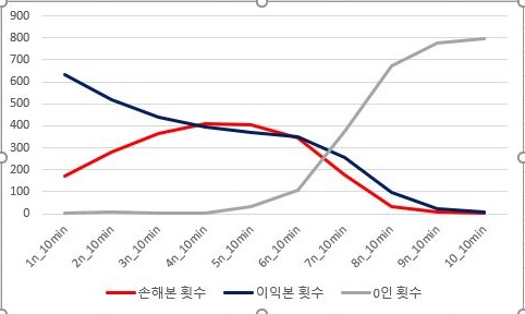 그리고 나서 손해와 이익을 본 종목의 갯수와, 그와 더불어서 거래가 없는 종목의 갯수까지 고려를 해 보았습니다. 일단 4번 조건에서 손해가 이익을 보는 경우보다 더 많아지고, 그게 6번 조건에서 역전이 되는데, 이 시점부터 거래가 없는 경우의 수가 너무 많아져서 문제가 많으리라 생각이 듭니다.
