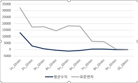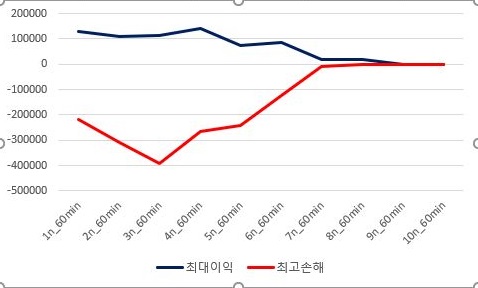 그리고 나서 최대로 본 이익과 제일 크게 본 손해를 비교해 보았습니다. 일단 여기서 어느 조건이 좋은지 정리를 바로 할 수는 없지만, 사실상 평균수익을 볼 때 1번 조건 말고는 크게 쓸모가 없다는 것을 알 수 있었습니다.