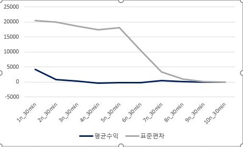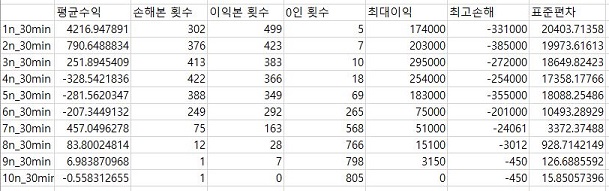 그리고 나서 다음으로는 캔들챠트 데이터 베이스가 30분 단위인 데이터를 사용해서 얻은 결과를 가지고서 한번 알아보도록 해야 합니다.