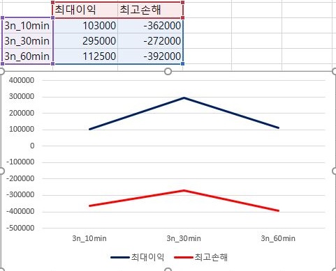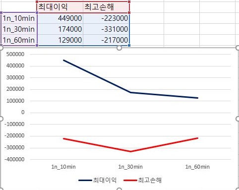 다음으로 2번 조건에서 한번 확인을 해 보았습니다. 여기서 나오는 결과는 일단 최고 이익은 거의 변하지 않지만, 30분봉에서는 손해가 더 커지고, 그게 줄어드는 60분봉에서는 이익이 감소하는 결과를 보여줍니다.