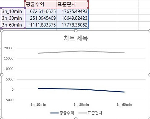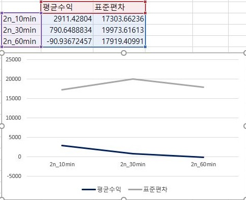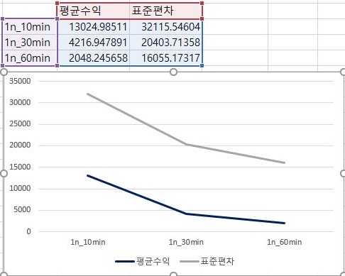 먼저 가장 좋은 결과를 내었는 1번 조건에서 한번 평균수익과 표준편차를 비교해 보았습니다. 일단 10분봉 캔들챠트 데이터 베이스를 사용하는 것이 아니라면, 그렇게 좋은 결과가 나오지 않고 있습니다.