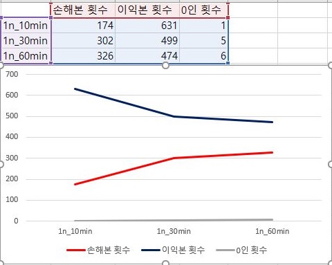 그리고 나서 이익과 손해를 본 종목의 갯수를 한번 비교해 보았습니다. 일단 1번 조건에서는 분봉차트에서 분봉의 간격이 커지면 커질 수록 이익은 더 적게 보고, 손해는 더 크게 보는 것을 확인할 수 있었습니다.