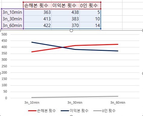그리고 나서 다음으로 2번 조건에서 보았습니다만, 여기서는 60분봉에 이르러서는 줄어든 정도가 아니라 아예 손해를 본 종목의 갯수가 이익을 본 종목의 갯수를 상회하는 것을 볼 수 있었습니다.