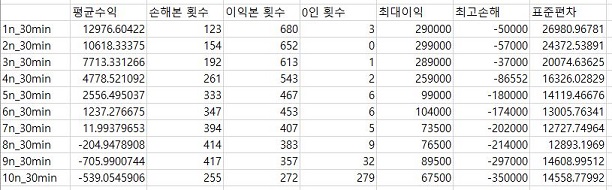 그리고 나서 마지막으로 일단 최대로 본 이익의 크기와 손해의 크기를 비교해 보았습니다. 일단 여기서는 특별한 경향이 없이 손해의 최대치는 변화가 있지만, 이익은 거의 변하지 않았습니다. 결국 결론을 내리자면, 10분봉을 사용한 경우는 어떻게 2번 조건까지가 추천하며, 30분봉을 사용한 경우에는 4번까지 어떻게 사용이 가능한 수준이며, 60분봉에서는 3번 조건까지가 마지노선입니다. 일단 다른 조건에 비해서 더 많은 조건들이 수익을 내고 있습니다만, 이제 어느 데이터 베이스를 사용한 결과가 가장 좋은지 비교해 보아야 합니다.