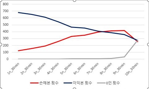 그리고 나서 이익의 최대치와 손해의 최대량을 한번 비교해 보았습니다만, 일단 손해 자체는 그렇게 큰 변화가 없다가 마지막 10번째 조건에서 급격히 증가하는 것을 볼 수 있습니다. 그에 반해서 이익의 최대치는 꾸준히 하락하는 경향을 보이고 있습니다.