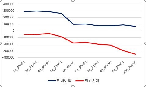 그리고 나서 이익과 손해의 최대치를 비교해 보니, 일단 이익의 최대치는 점점 조건이 빡빡해 질 수록 점점 감소하고, 반대로 손해의 최대치는 증가한다는 것을 알 수 있었습니다.