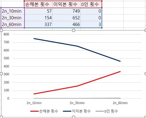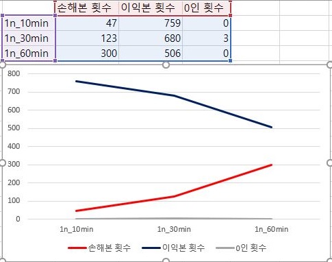 다음으로는 1번 조건에서 손해를 본 종목의 갯수와 이익을 본 종목의 갯수를 한번 비교해 보도록 했습니다. 우선 여기서는 분봉의 간격이 커지면 커질수록 이익보는 종목은 적어지고, 손해보는 종목의 갯수는 더 많아진다는 것을 알 수 있었습니다.
