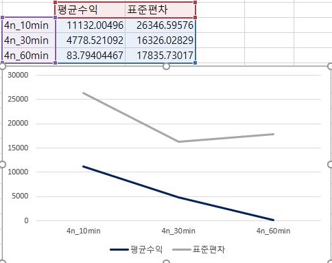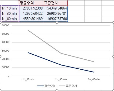 그리고 나서 먼저 1번 조건에서 평균수익과 표준편차에 관해서 한번 비교를 해 보아야 합니다. 여기서 분봉의 간격이 커지면 커질 수록 평균수익이 급격히 떨어지는 것을 확인할 수 있었습니다.