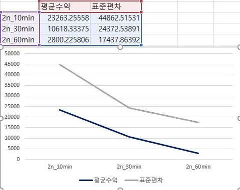 그리고 나서 먼저 1번 조건에서 평균수익과 표준편차에 관해서 한번 비교를 해 보아야 합니다. 여기서 분봉의 간격이 커지면 커질 수록 평균수익이 급격히 떨어지는 것을 확인할 수 있었습니다.