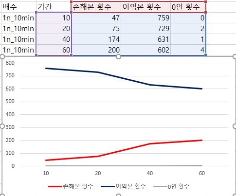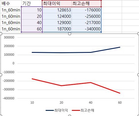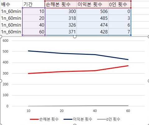 그리고 나서 다음으로는 이익의 최대치와 손해의 최고치를 비교해 보았습니다만, 이게 60기간에서 손해는 확실히 최고로 증가가 되었고, 이익의 최대치는 변화가 없다가 마지막에 가서야 증가를 하는 것을 볼 수 있었습니다. 다만 여기까지 했는 것으로는 100% 확신을 할 수 없기 때문에, 일단 다른 조건에서 한번 더 확인을 해 보아야 할 필요성이 있습니다.