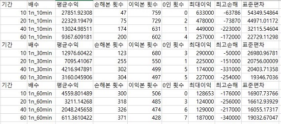 그리고 조금은 의외인 결과가 나오긴 했는데, 일단 최대로 본 이익의 최대치는 60이라는 period일 경우에 가장 컸지만, 문제는 손해의 최대치도 커진다는 것을 알 수 있었습니다.