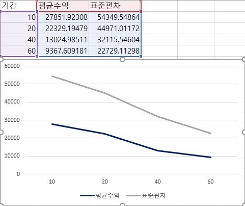 그리고 나서 다음으로는 손해를본 종목의 갯수와 이익을 본 종목의 갯수를 비교해 보았습니다. 일단 여기서는 우선 위 스크린샷에서 볼 수 있는 것처럼 40 period까지는 기울기가 정말 완만하게 이익본 종목의 갯수는 감소하고, 손해본 종목의 갯수는 커지다가 60기간에 이르러서 더 가파르게 꺽이는 것을 볼 수 있었습니다.
